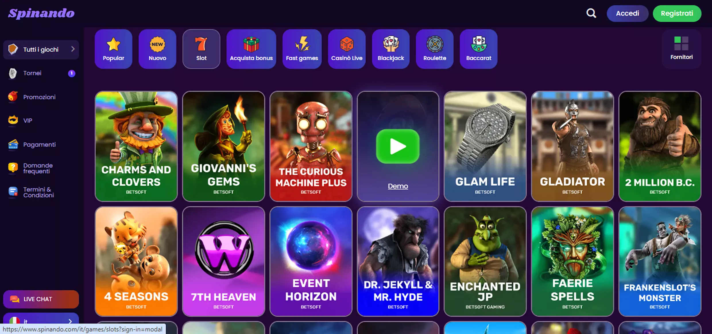 Spinando Casinò Italia offre numerosi giochi, tra cui slot, giochi da tavolo e Live Casinò. Grazie